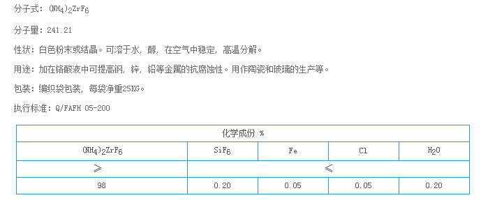 分子式:(NH4)2ZrF6分子量:241.21性狀:白色粉末或結晶。可溶于水 醇 在空氣中穩(wěn)定 高溫分解。用途:加在鉻酸液中可提高鋼 鋅 鉛等金屬的抗腐蝕性。用作陶瓷和玻璃的生產(chǎn)等。...