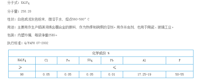 分子式:KAlF4分子量:258.28性狀:白色或淺灰色粉末, 微溶于水, 熔點560-580°C用途:主要用作生產(chǎn)鋁鎂澆鑄含硼合金的原料, 作為熱焊和銅焊的溶劑。用作殺蟲劑, 也用于陶瓷、玻璃工業(yè)。...