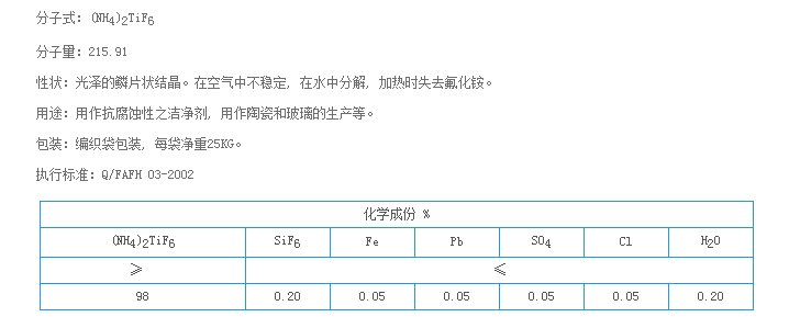 分子式:(NH4)2TiF6分子量:215.91性狀:光澤的鱗片狀結(jié)晶。在空氣中不穩(wěn)定, 在水中分解, 加熱時(shí)失去氟化銨。用途:用作抗腐蝕性之潔凈劑, 用作陶瓷和玻璃的生產(chǎn)等。...